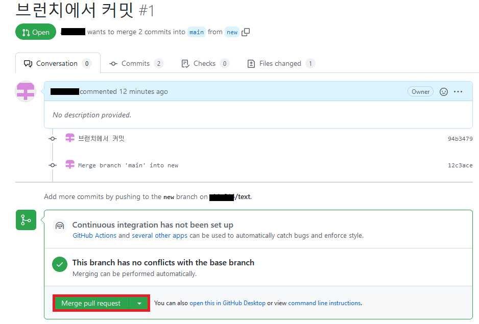 아래의 merge버튼을 누른 뒤, push 해주면 됩니다.