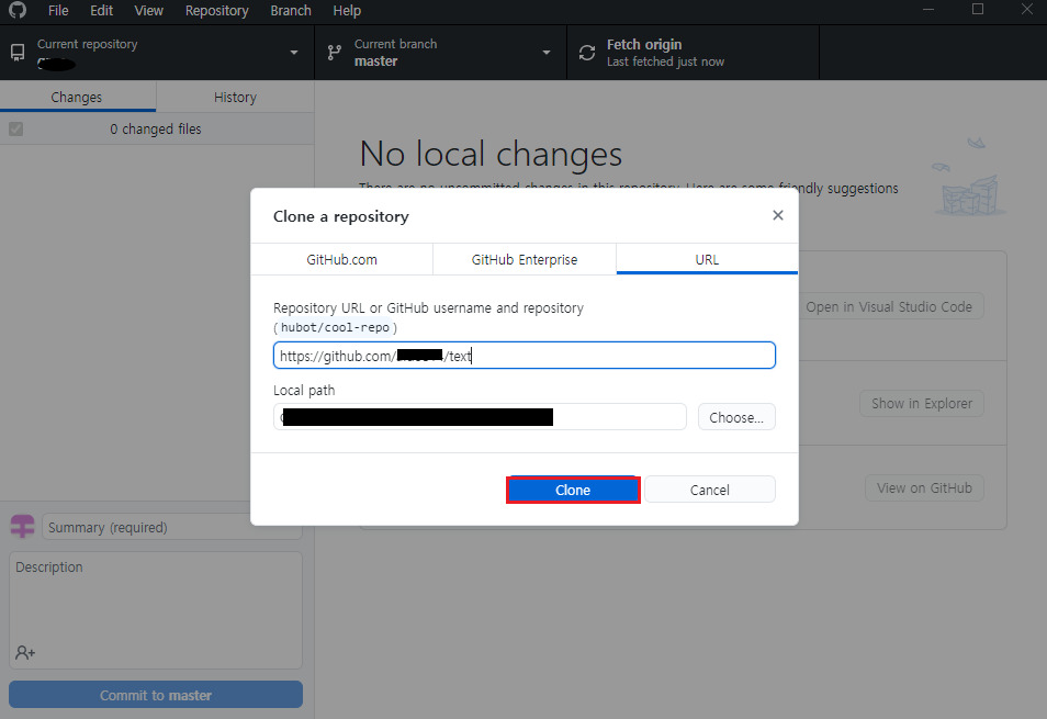로컬 저장 주소를 확인 해주신 뒤, clone 버튼을 눌러주시면 됩니다.