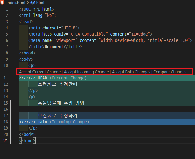 내가 수정한 파일과 main의 파일이 충돌이 되면, vscode에 다음과 같이 표시됩니다.