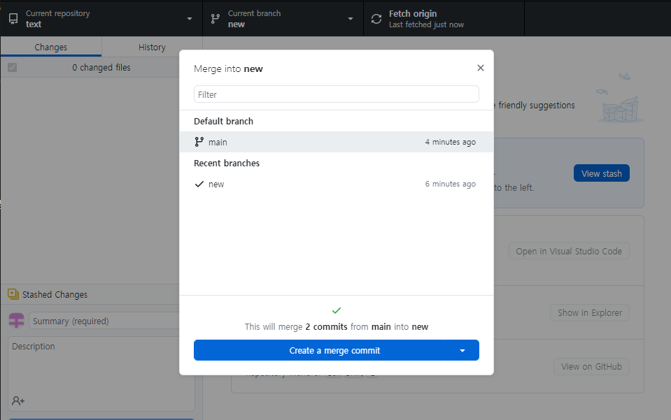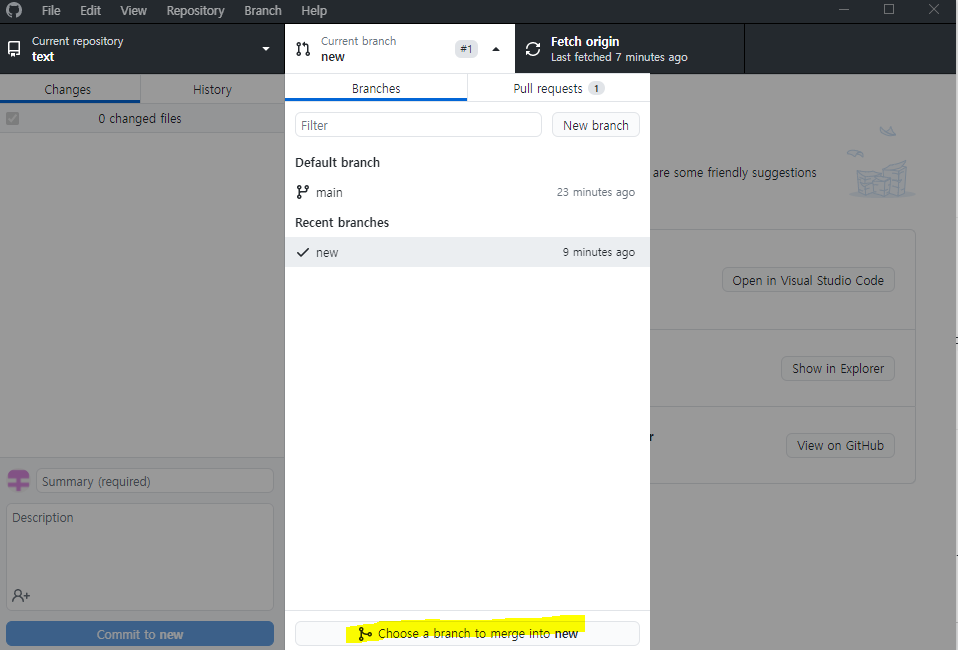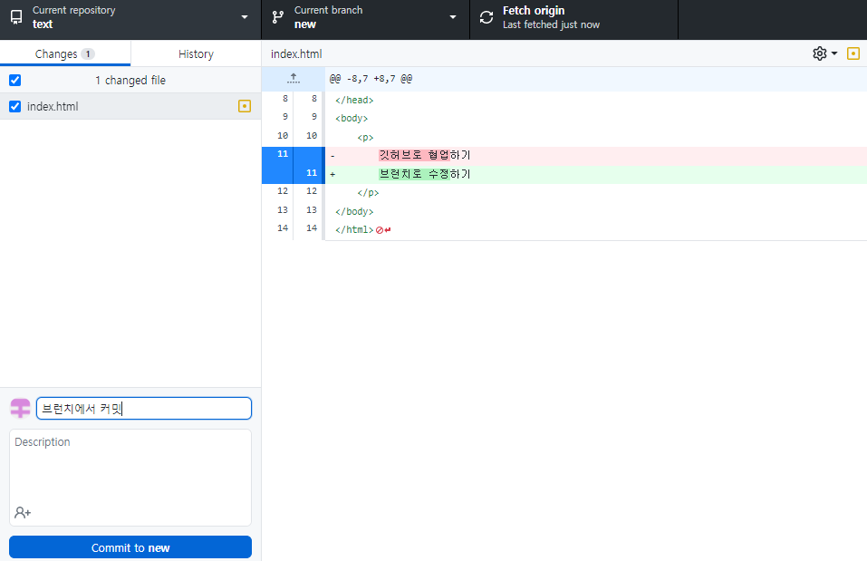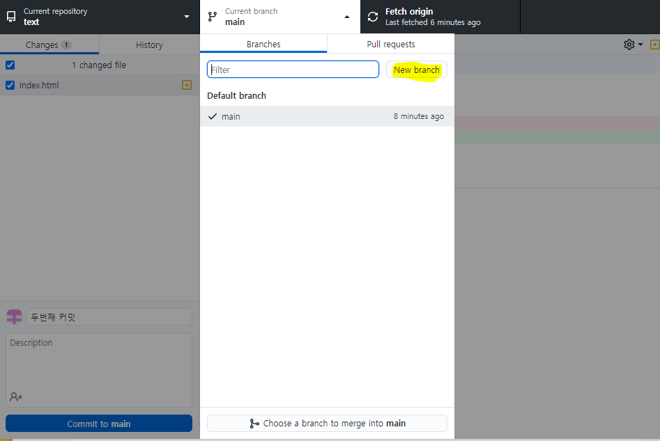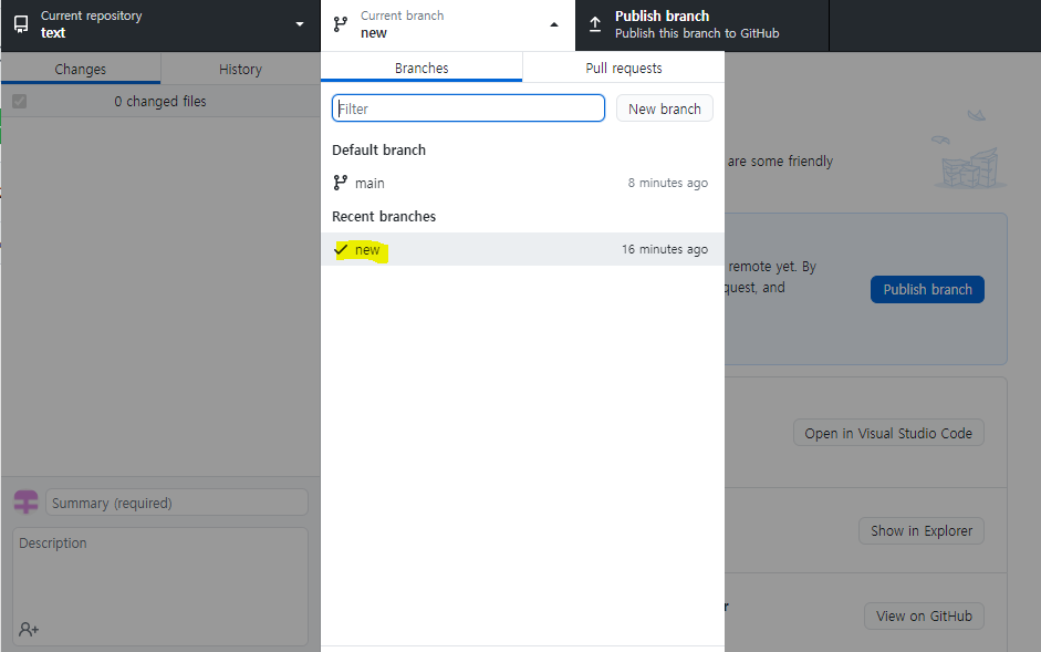 생성한 브런치를 눌러 기존 main에서 -> new(새로운 브랜치)에서 작업해줍니다.