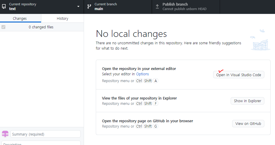 Set up in Desktop 버튼을 누르게 되면 깃허브 데스크탑이 실행됩니다.