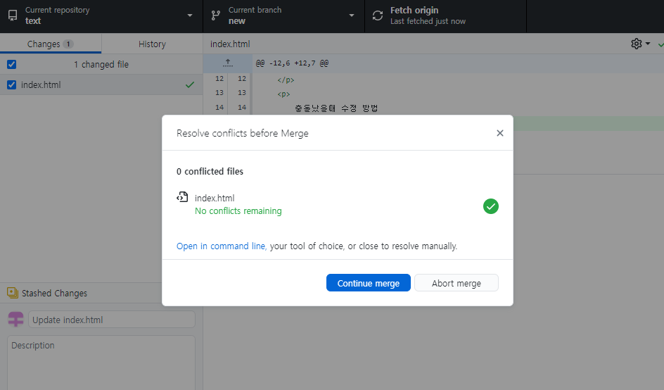 충돌(Confilcts)해결, 병합완료 팝업입니다.