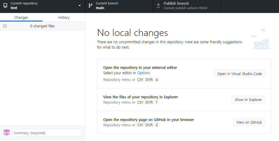 여기까지 잘 따라해주셨으면 다음과 같은 화면이 나오면 Github 데스크탑의 세팅이 끝났습니다!
