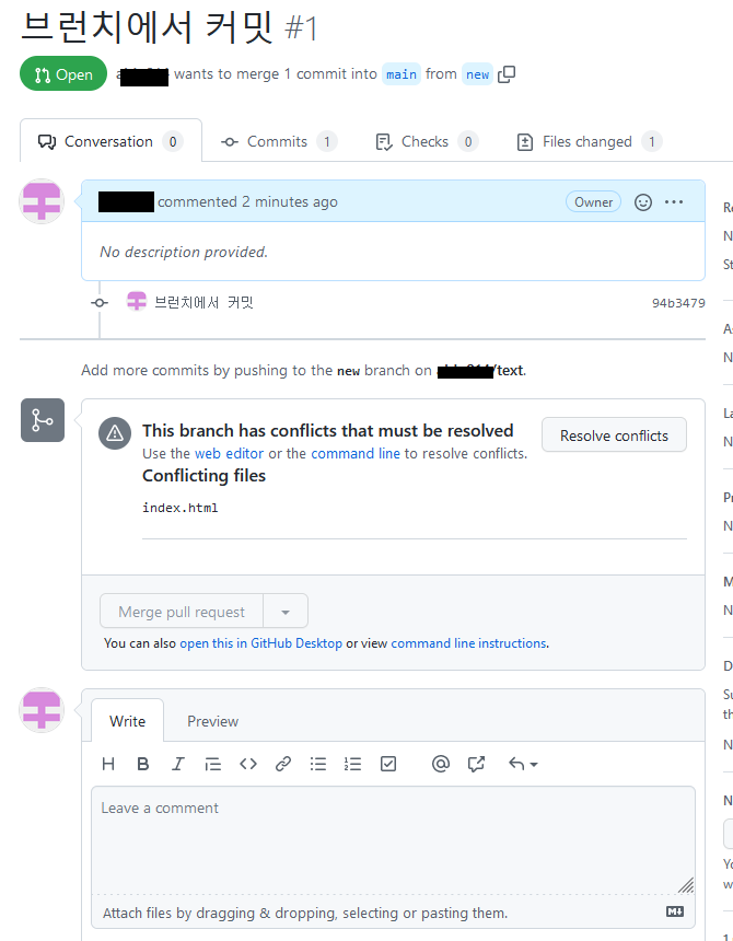 main과, 내가 수정한 파일과 충돌(Conflict)이 있으면 다음과 같은 팝업이 나옵니다.
