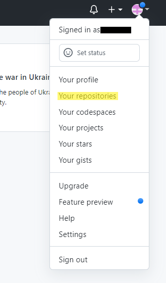 로그인 후 , 우측 상단에 아이콘을 누른뒤 , your repositories를 눌러줍니다.