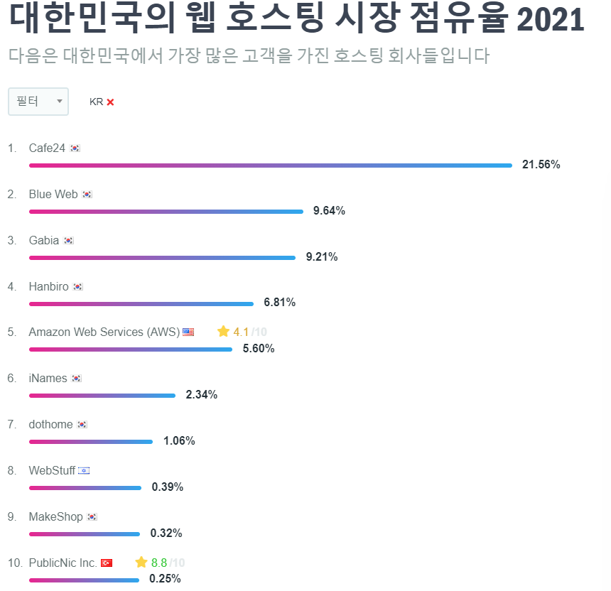 역시나 cafe24가 압도적으로 점유율이 높습니다. 그 다음엔 blue Web이 2위, 가비아가 3위를 차지했습니다.